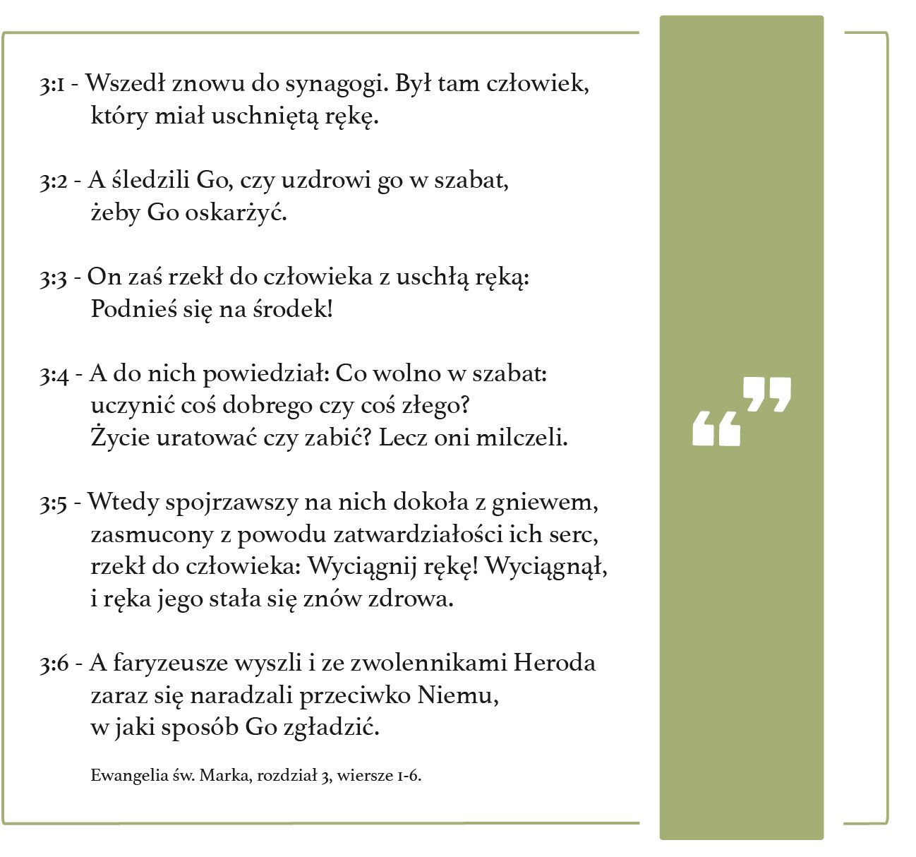 Jezus przyszedł do Synagogi i spotkał tam człowieka z uschłą ręką. Taka choroba musiała być bardzo trudna i kłopotliwa w codziennym życiu. Był szabat, czyli dzień, w którym Żydzi nie mogli wykonywać żadnej pracy. Z kontekstu poprzedniego rozdziału wynika, że za Jezusem szli również faryzeusze i uczeni w piśmie, którzy chcieli przyłapać go na jakimś potknięciu.Jezus, widząc chorego, uzdrowił jego rękę, pomimo tego, że był szabat. Zagniewał i zasmucił się, że serce faryzeuszy - religijnych przywódców narodu - było twarde i nieczułe na potrzebę chorego.
